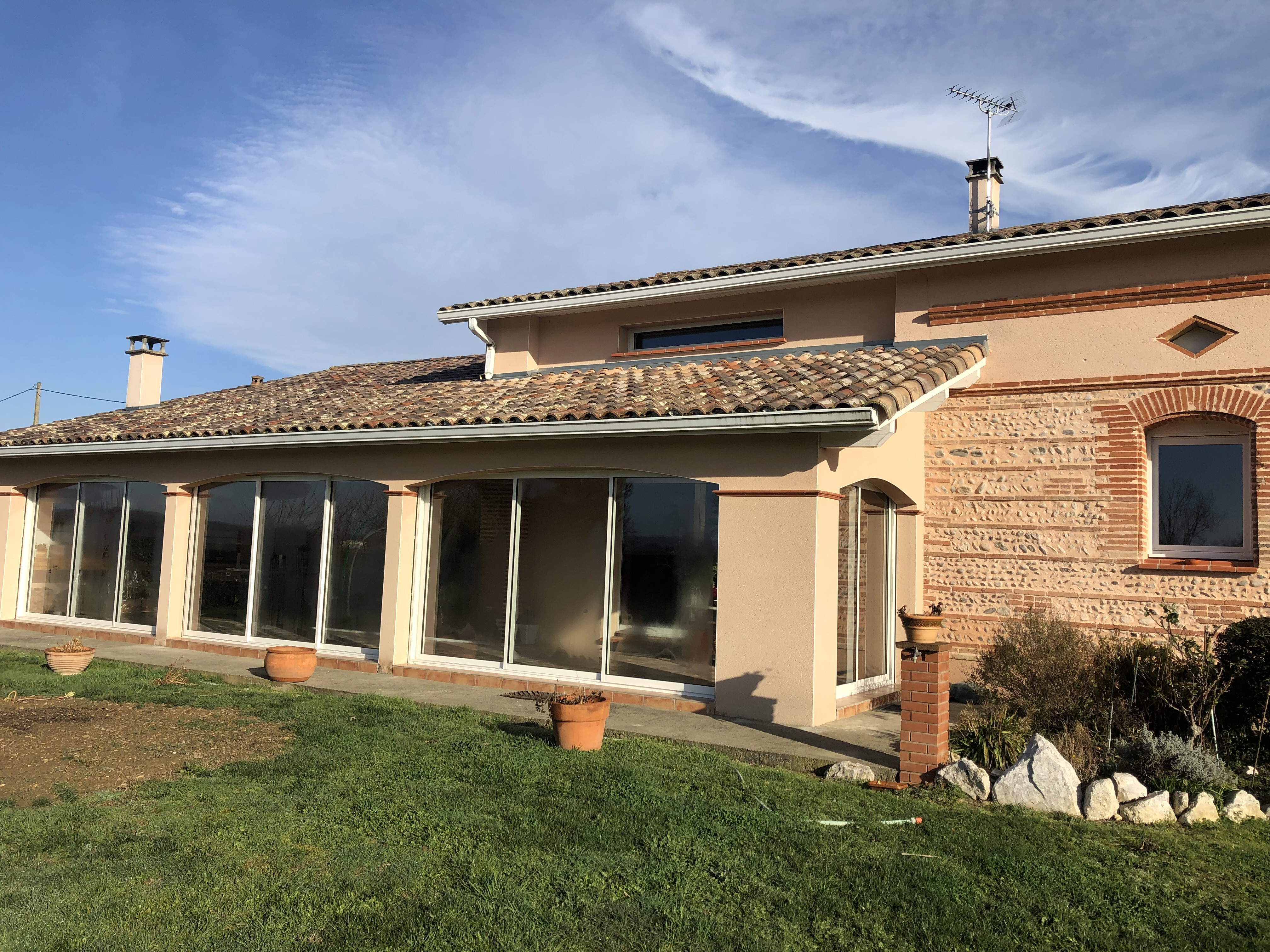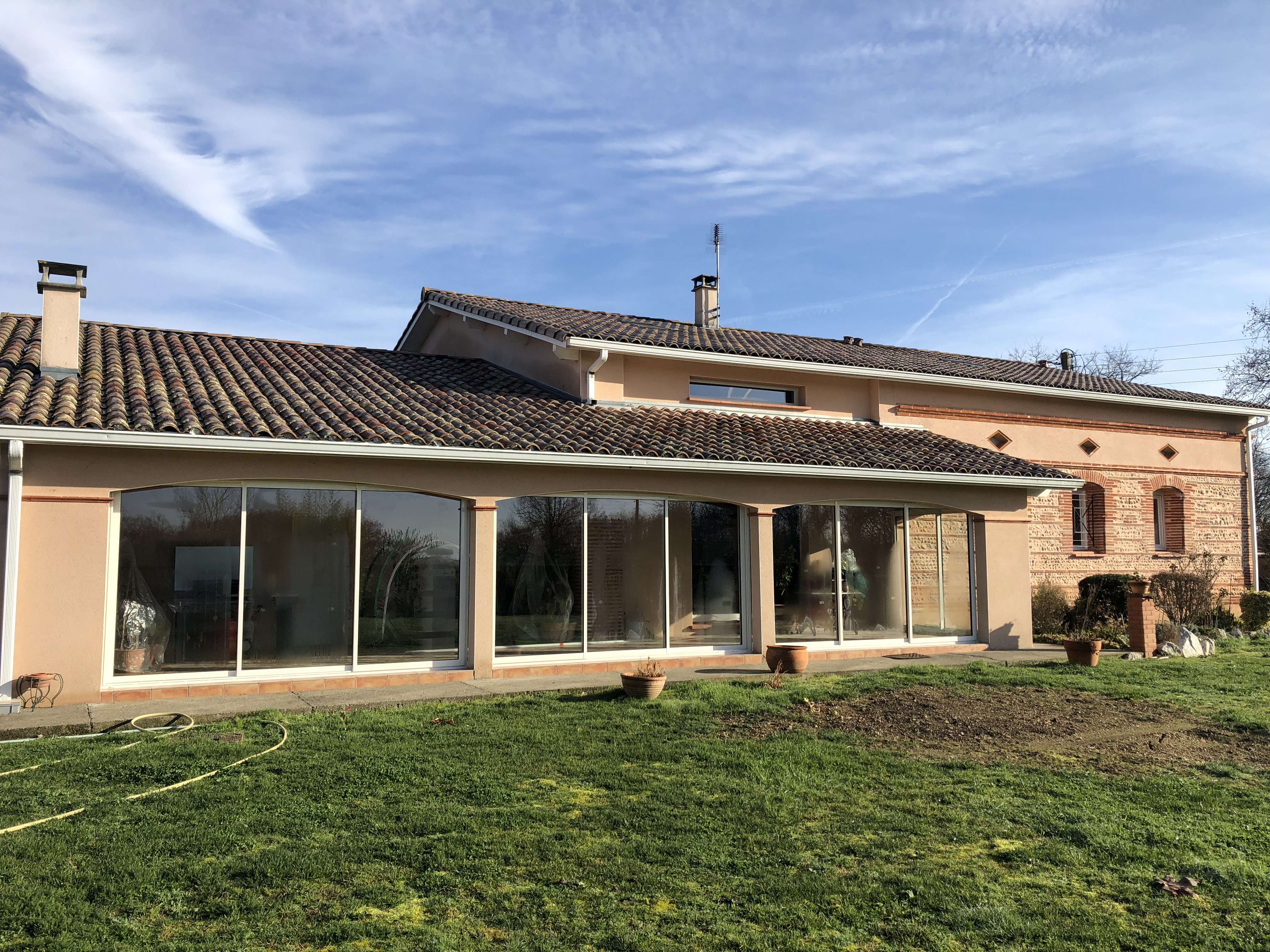 Fermeture de terrasse avec des coulissants en alu blanc avec remplissage du cintre en panneau isolant