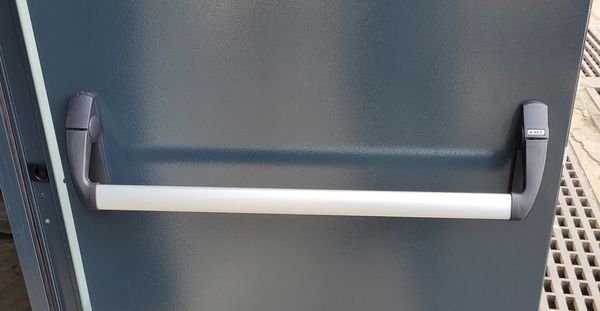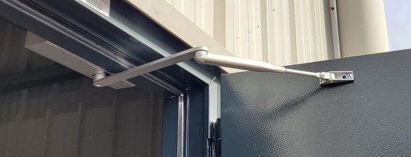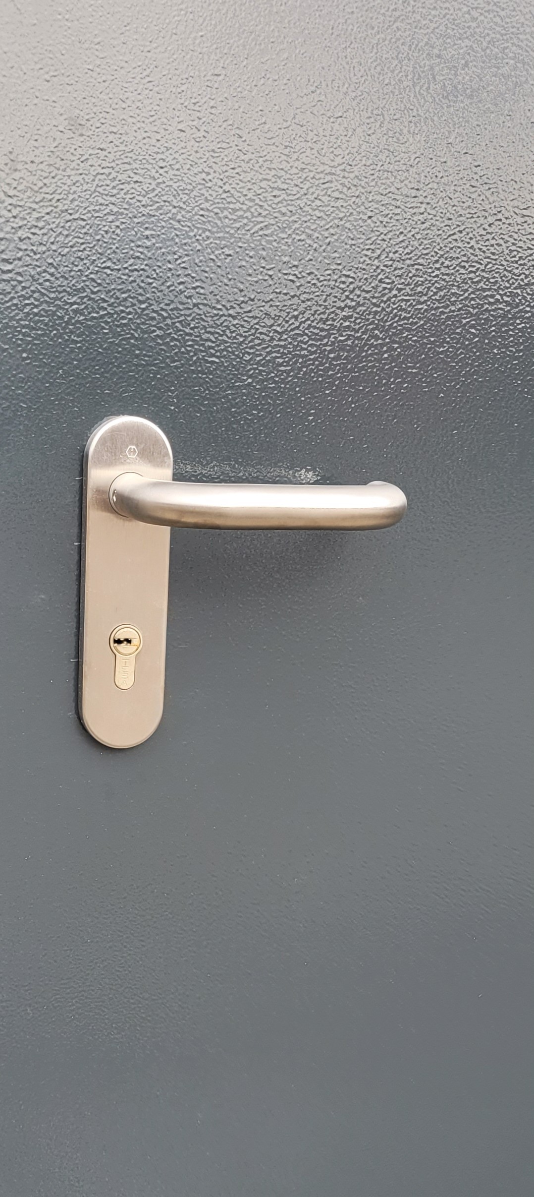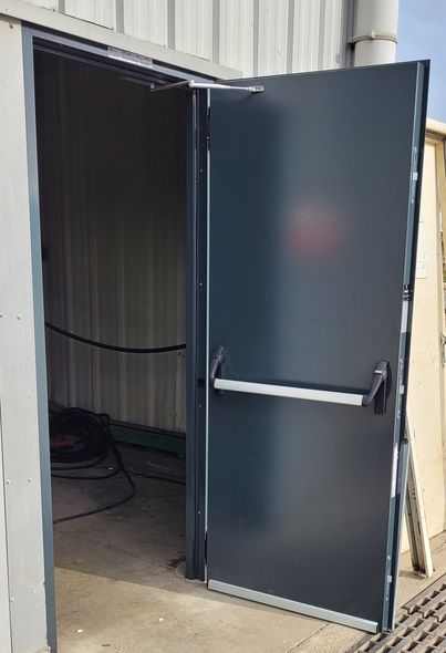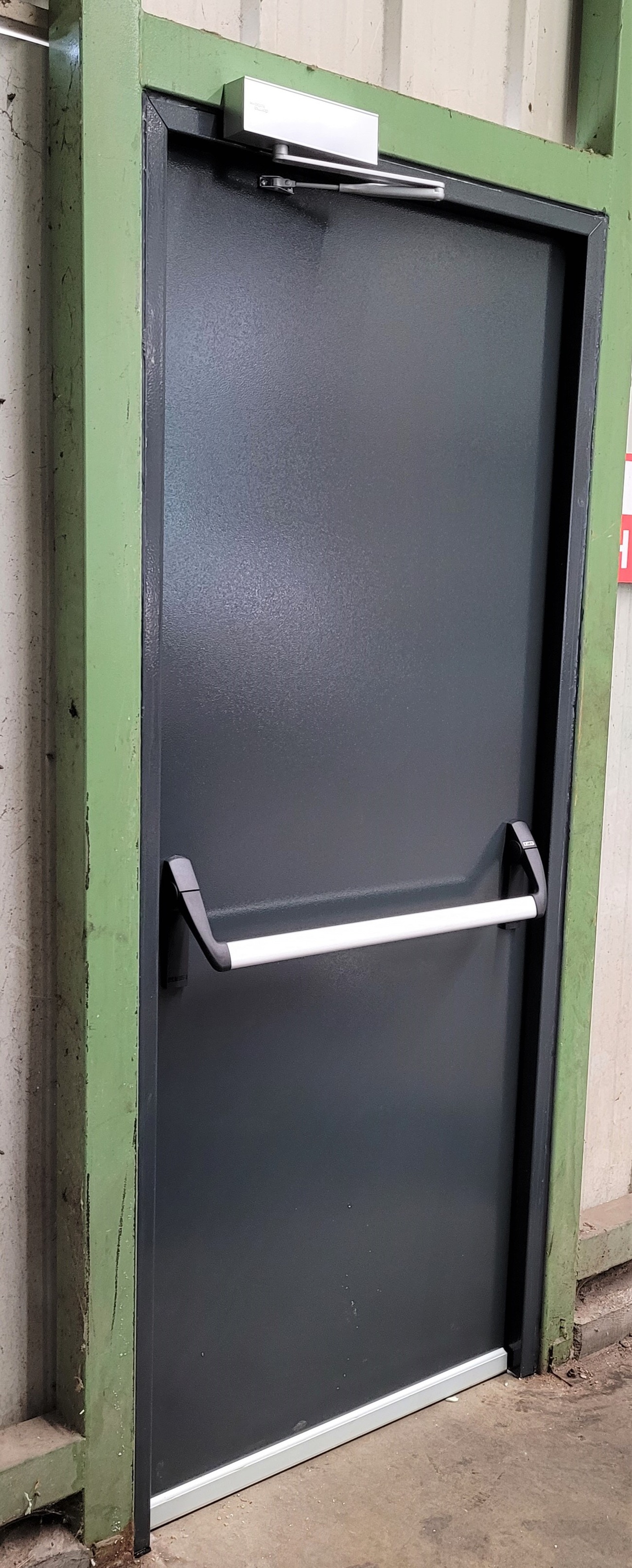 Équipée d’une serrure 3 points avec une barre antipanique et un ferme porte mécanique. Existe aussi en version coupe-feu.