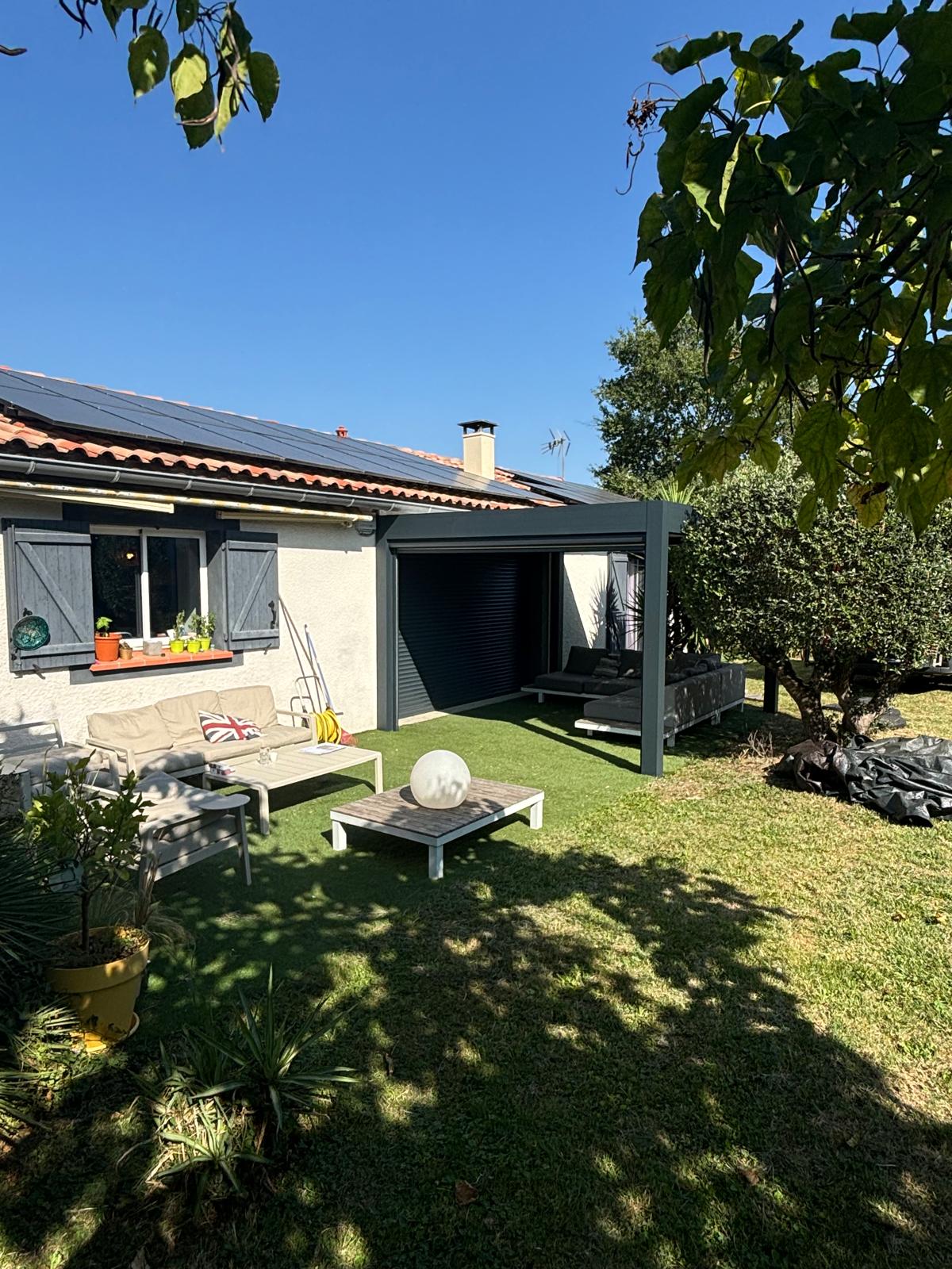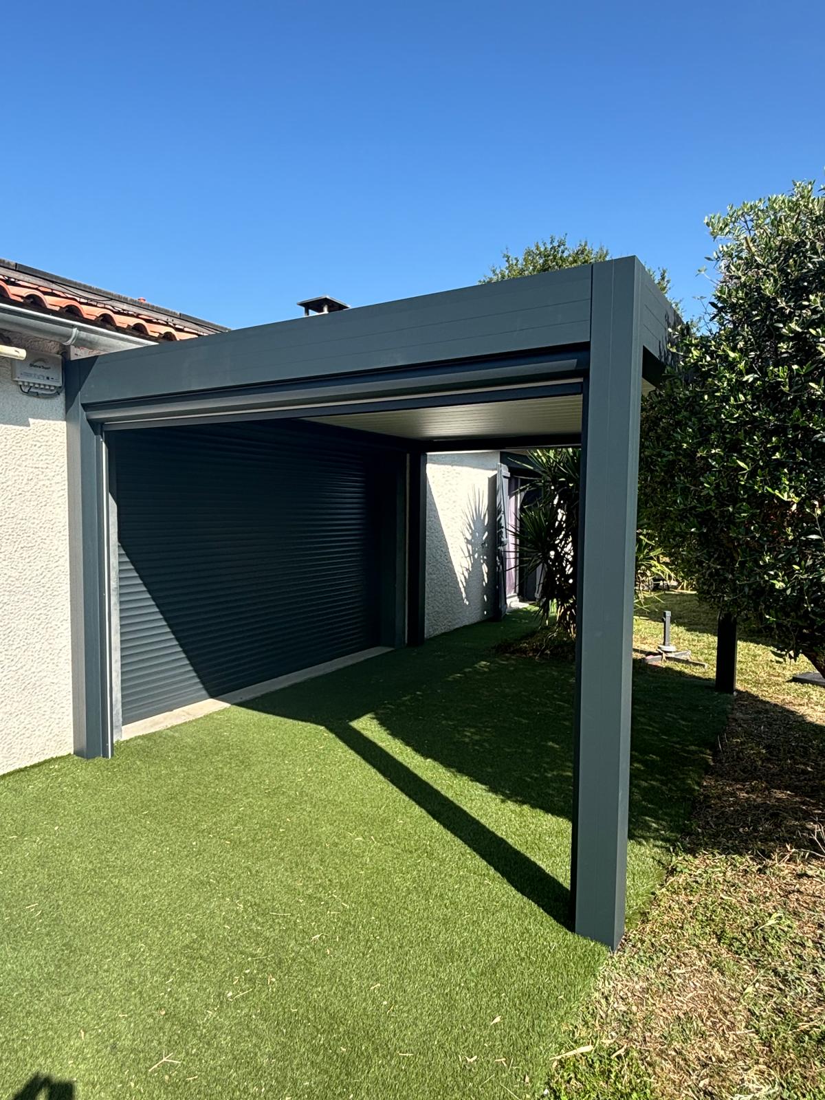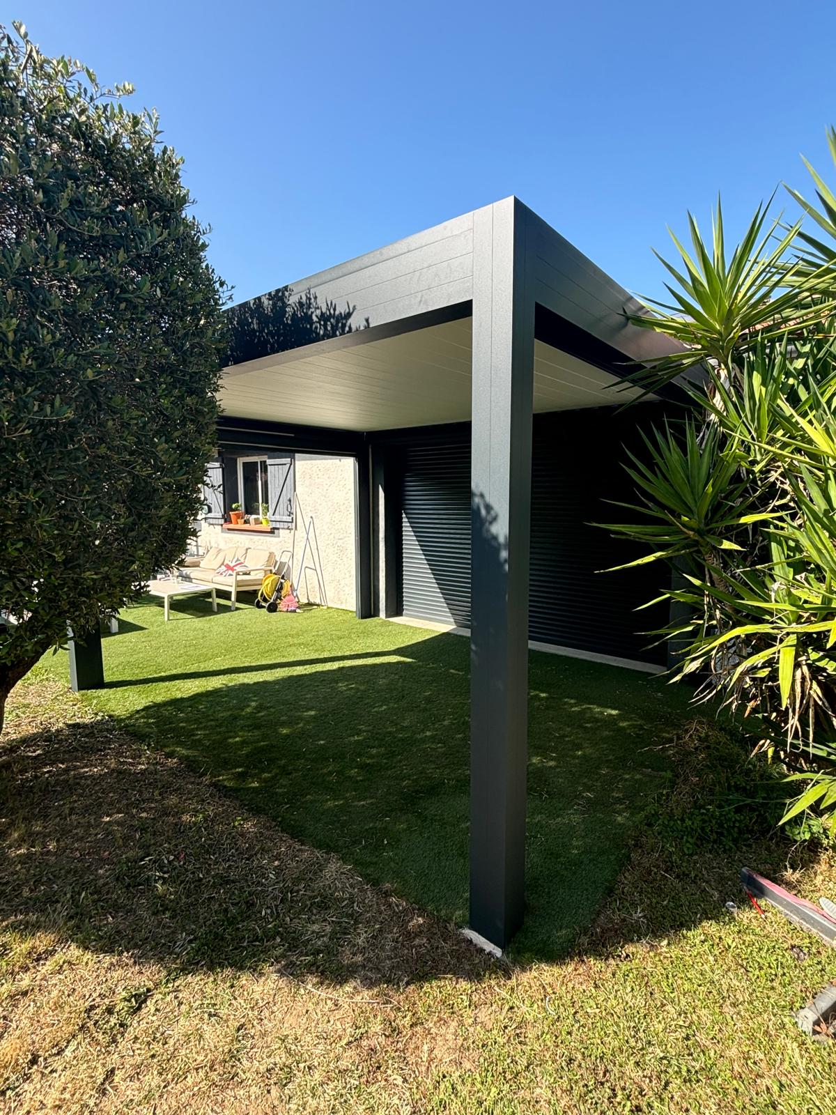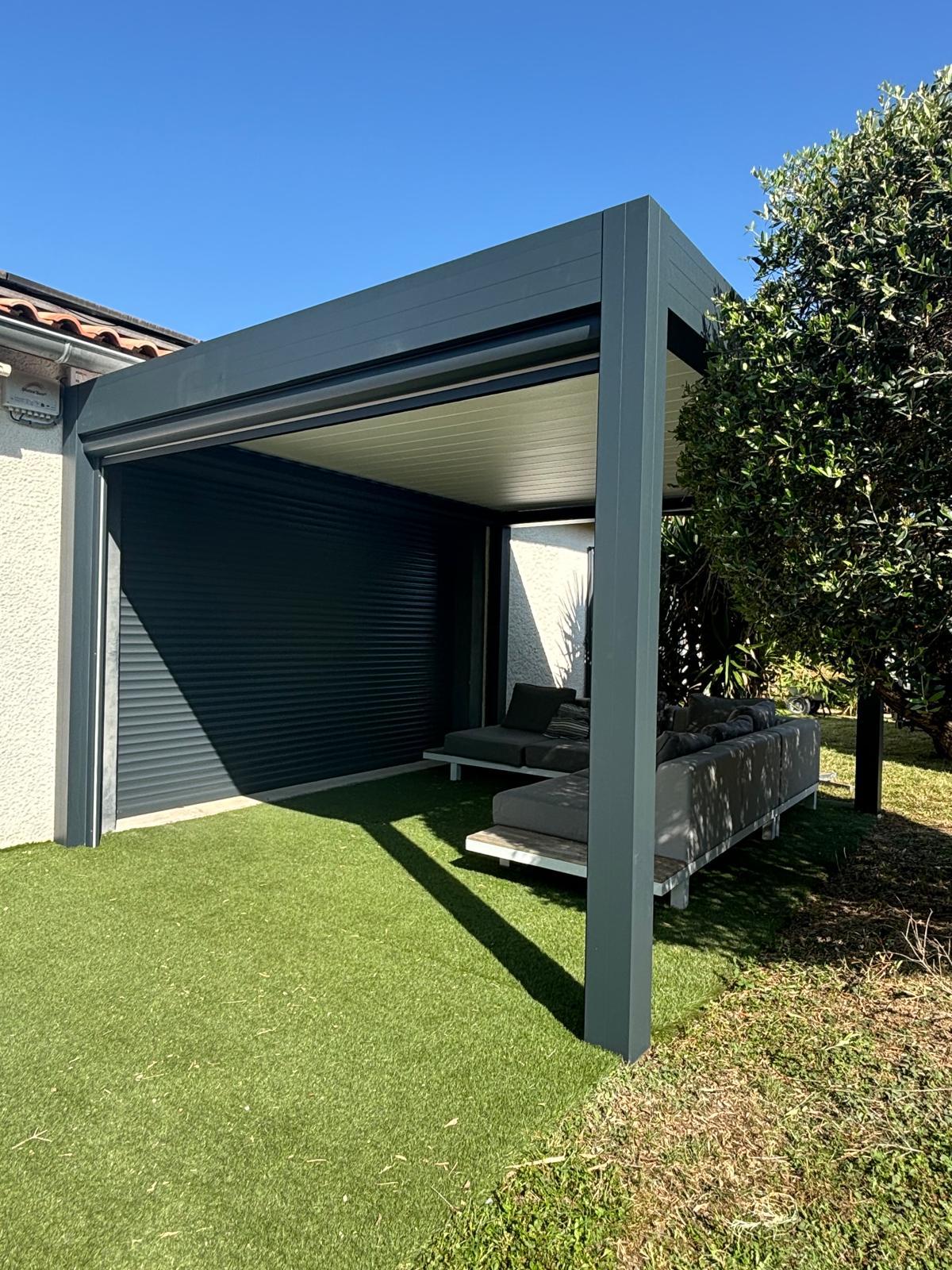 Pergola bioclimatique sur quatre pieds avec lames plates et store zip sur le côté