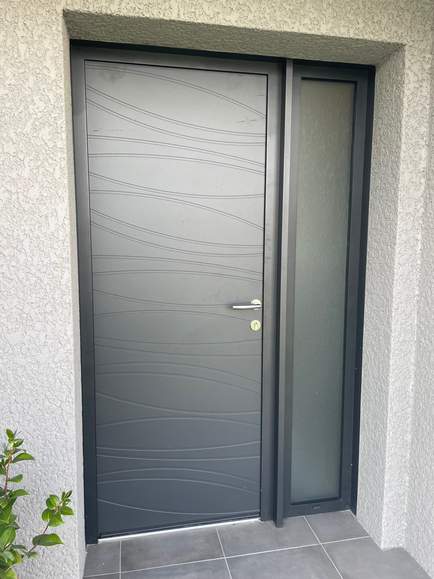 Pose d'une porte d’entrée pleine avec fixe latéral en aluminium noir metallic N2100.