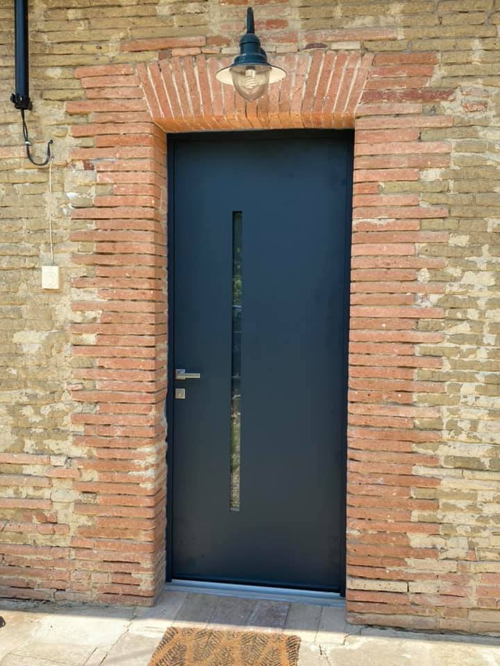 Remplacement d'une ancienne porte mal isolée par une porte en aluminium à forte capacité d'isolation.