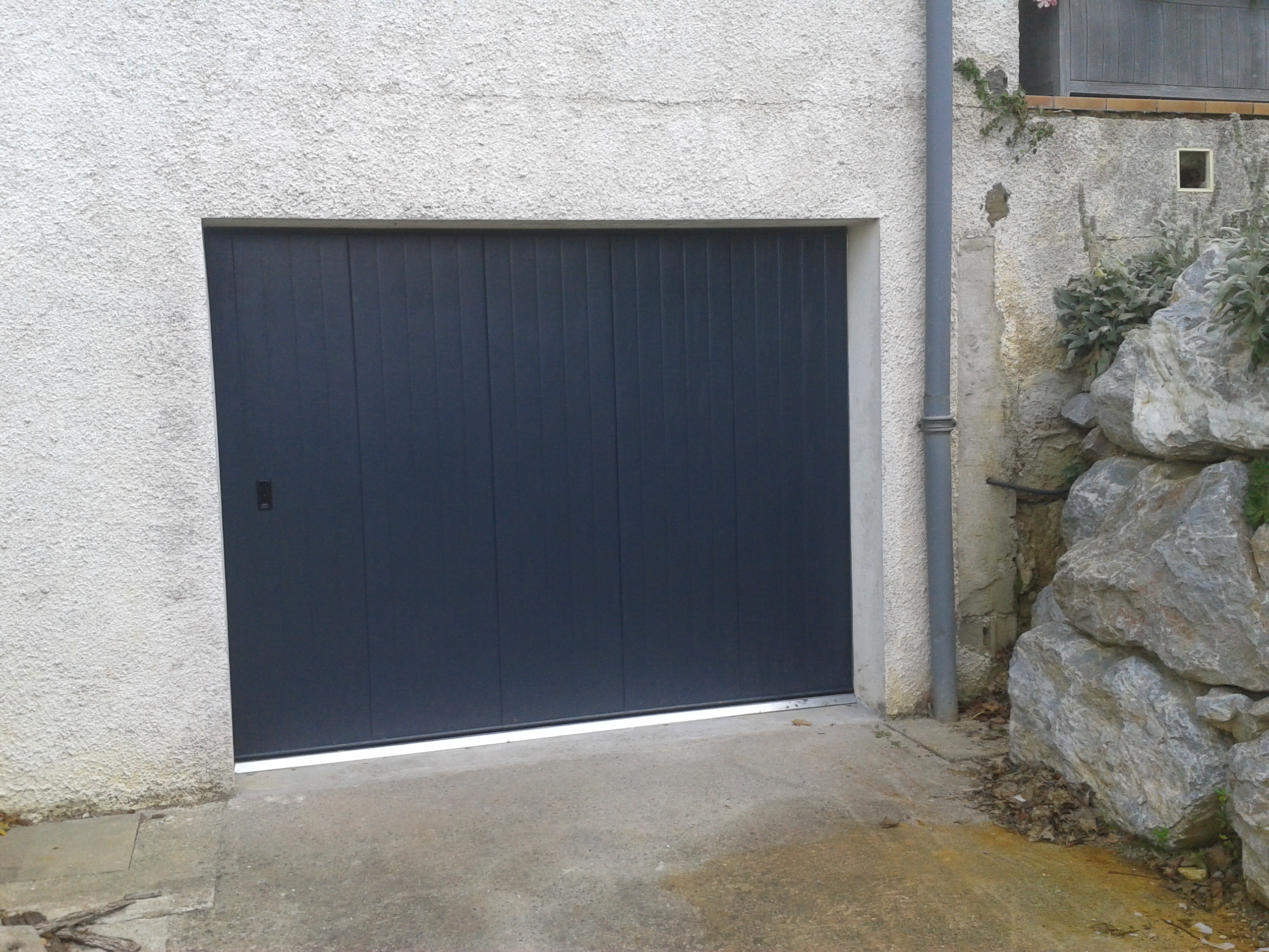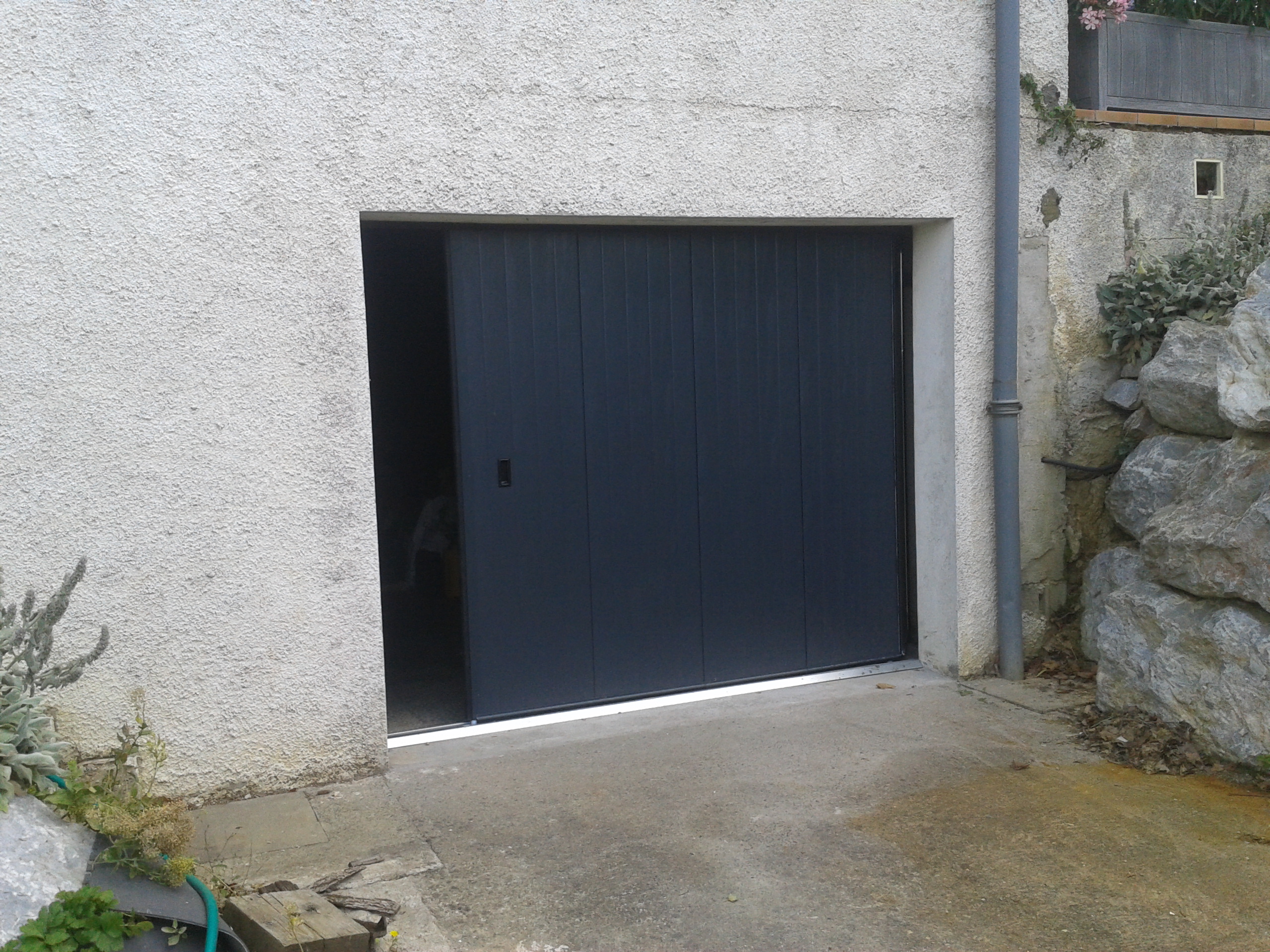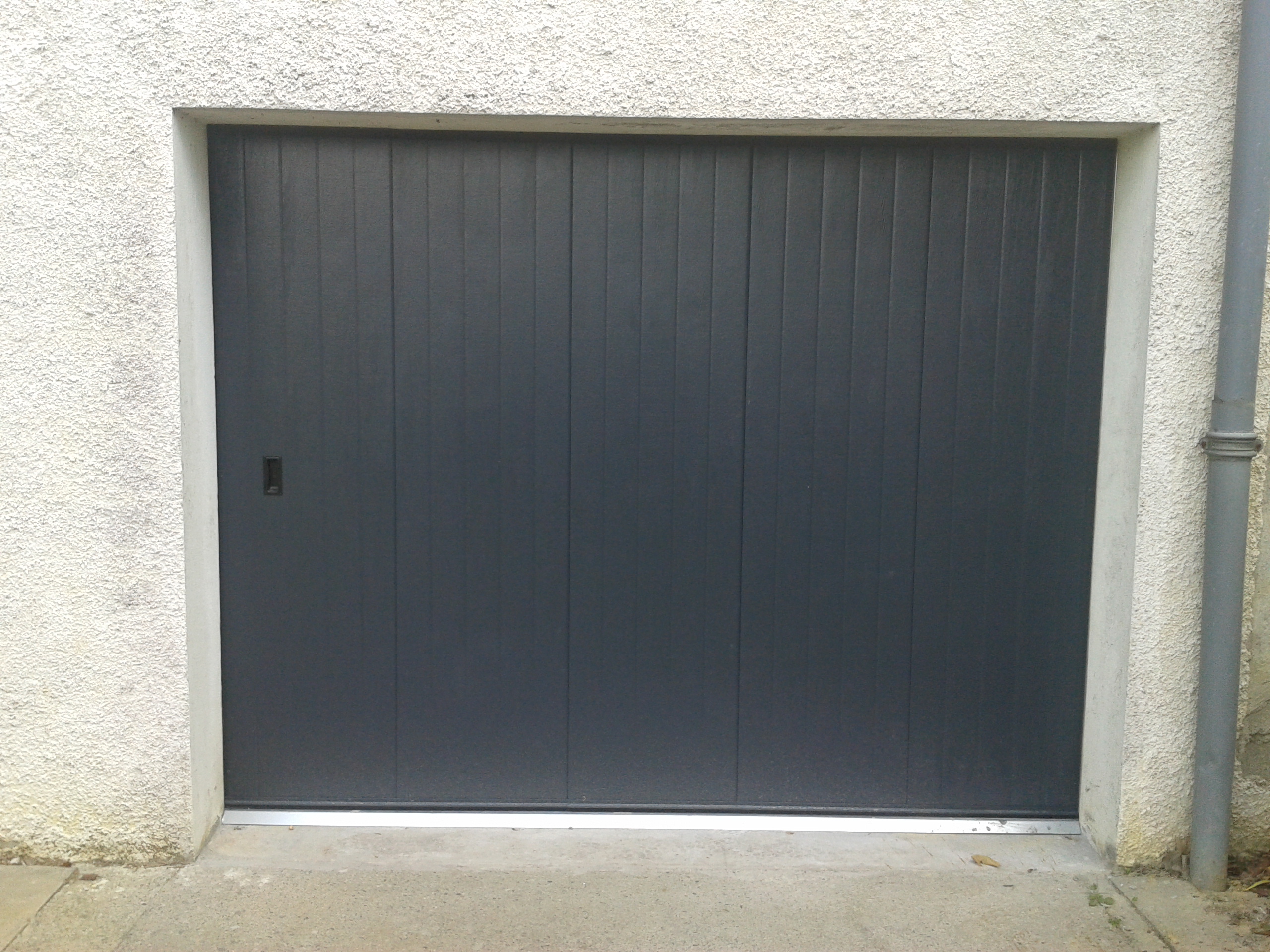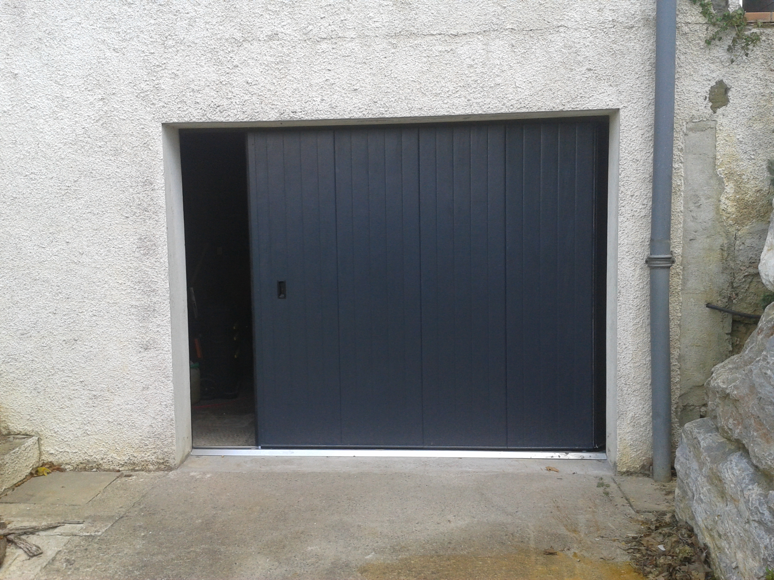 Porte de garage sectionnelle à déplacement latéral motorisée en acier isolée.
