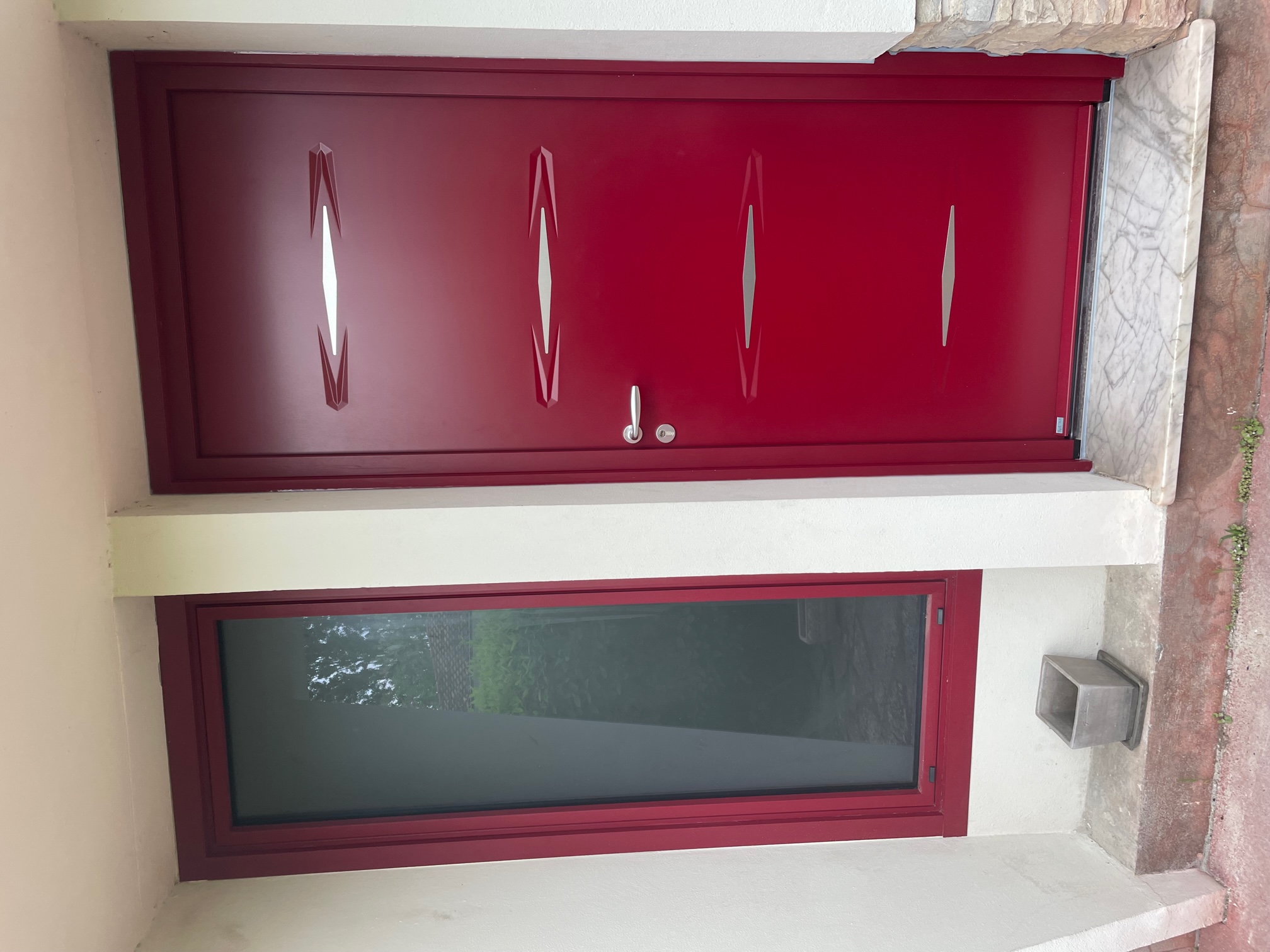 Porte d’entrée en aluminium rouge RAL 3004 avec châssis fixe à côté.